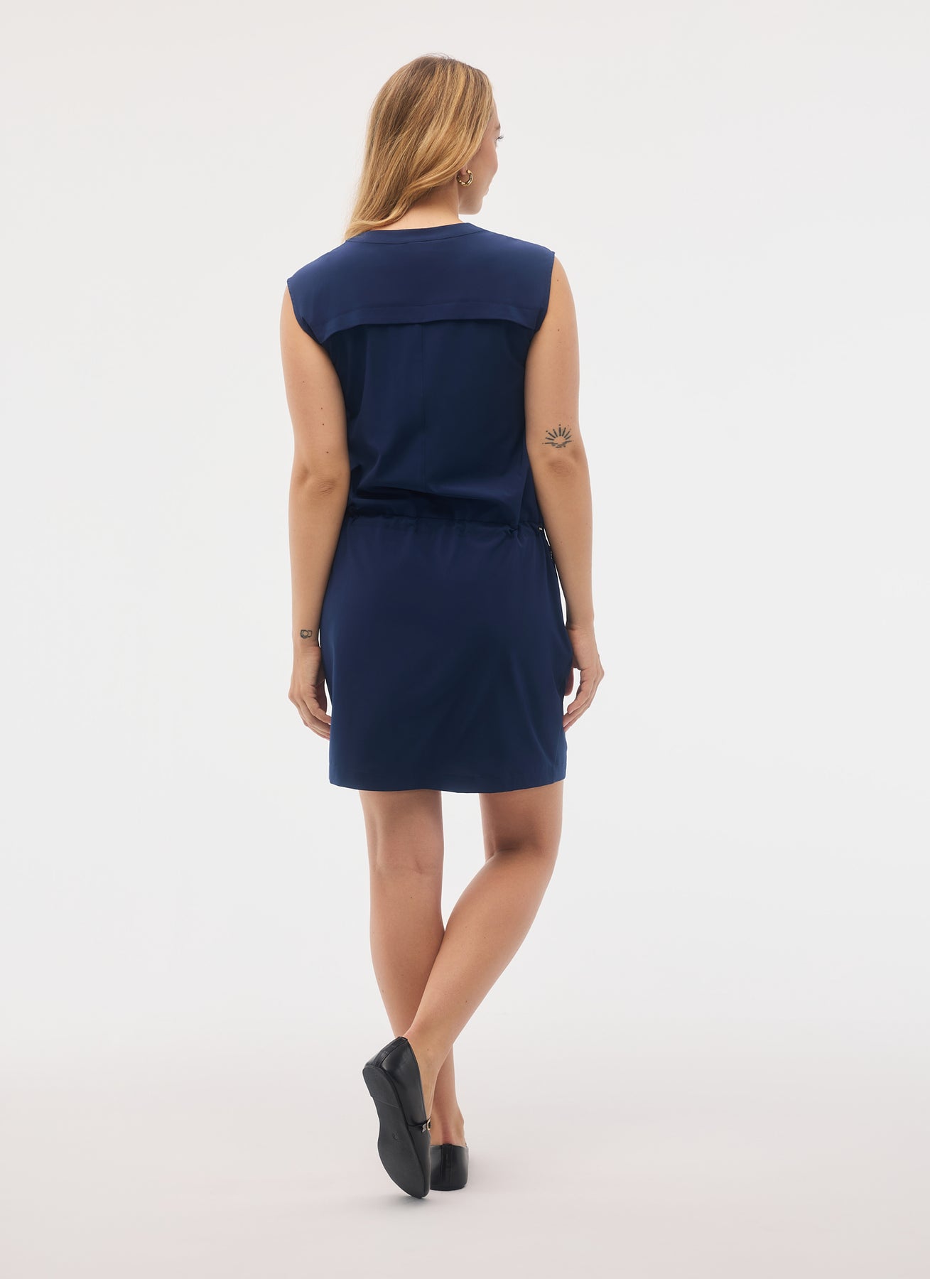 Fig Women's Rosamund Dress features Flex Ultra™ fabric crafted from 90% recycled polyester and 10% spandex, delivering quick-drying, moisture-wicking performance with UPF 50+ solar protection. This sleeveless zip-up dress offers a comfortable regular fit with an above-the-knee length, round neckline, and practical details including two front pockets and a secure zip pocket. The 4-way stretch, wrinkle-resistant fabric ensures easy care and all-day comfort, while the adjustable drawcord waistband provides a customizable fit. Perfect for active pursuits and warm-weather wear.