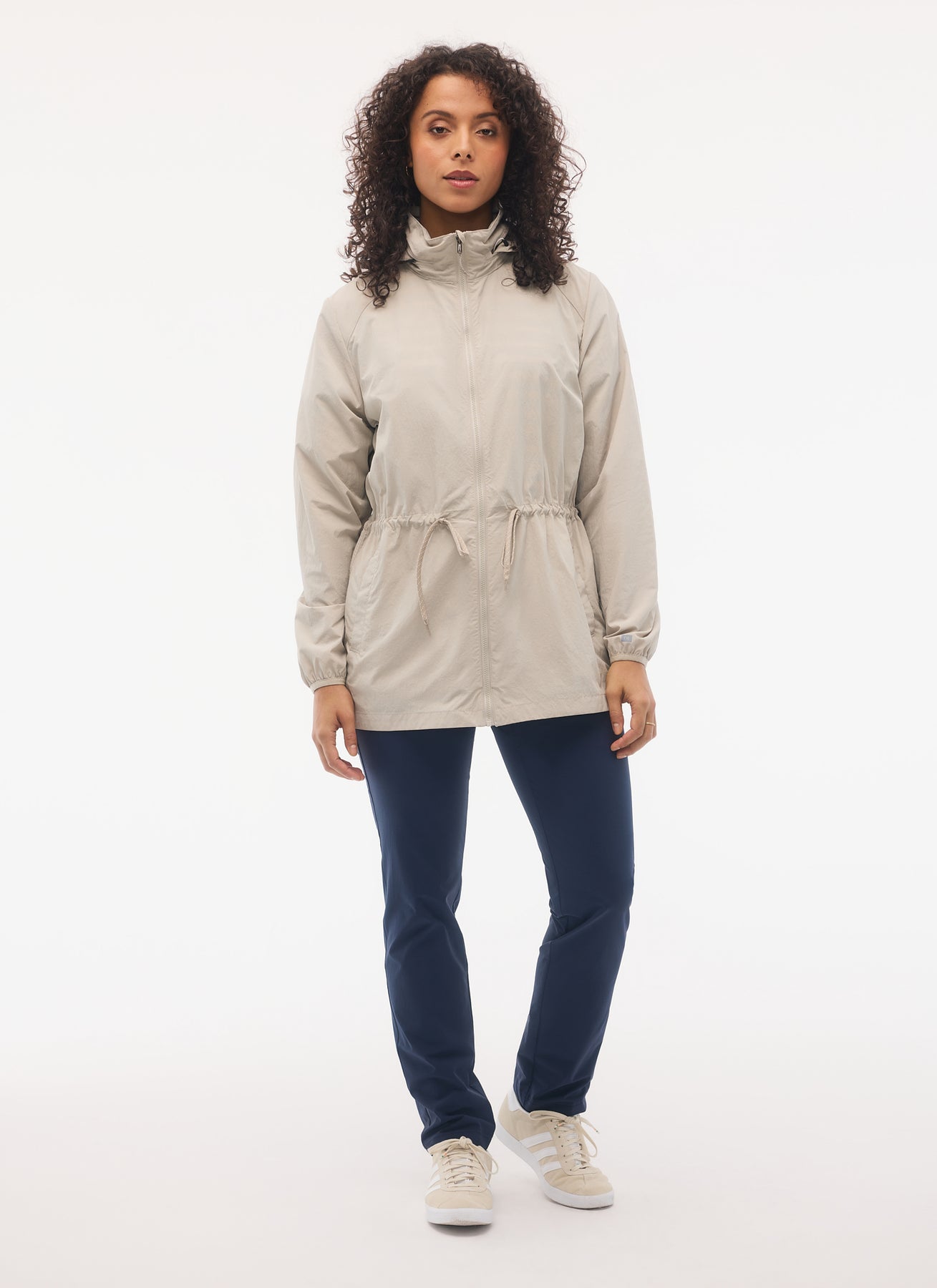The Fig Women's Naya 3/4 Jacket combines sustainable style with practical performance. Built from 100% recycled Möbius Nylon™ Taslan, this versatile layer resists water, wind, and wrinkles while offering UPF 25 sun protection. The cinch-waist silhouette features a packable hood, adjustable drawcords, elastic cuffs, and secure welt pockets—all designed for easy care and everyday comfort. At 30" in length with a regular fit, it's an eco-conscious choice for active lifestyles. Available in Mocha Latte and Night.