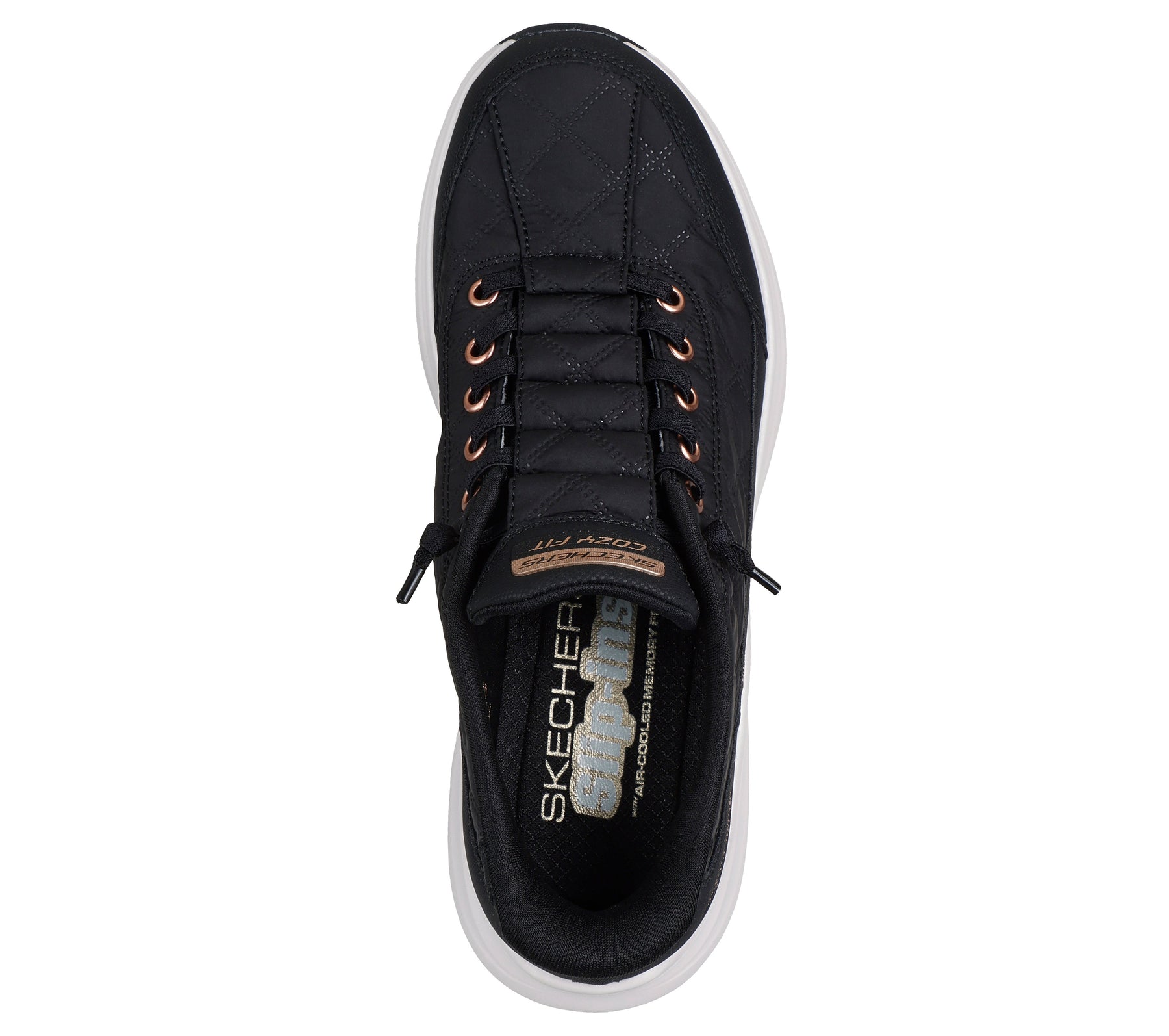PUFFER FIT™ Step into plush luxury and cozy comfort with Skechers Hands Free Slip-ins®: Contour Foam™ - Cozy Fit® Golden Hour. Designed with our Heel Pillow®, this slip-on style features a quilted Cozy Fit® and duraleather overlay upper with tied-off stretch laces, Contour Foam™ midsole cushioning, and our signature cushioned Skechers Air-Cooled Memory Foam® insole.